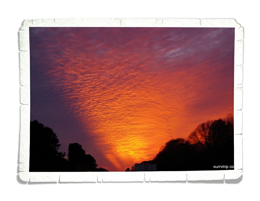 We caught this sunrise in North Carolina off the coast of Kitty Hawk (the bottom pic). We had the beach pretty much to ourselves that morning. Luckily, we didn’t have to get up too early since all we had to do was walk across the road to get to the beach. We’ve also had some pretty spectacular sunsets, but the one in the top pic really stands out for me. We were having dinner with some friends of ours in Alabama and this was our view. *waves at friends* It was a great evening filled with friends, food, and views.