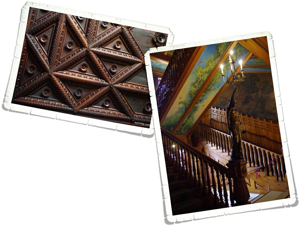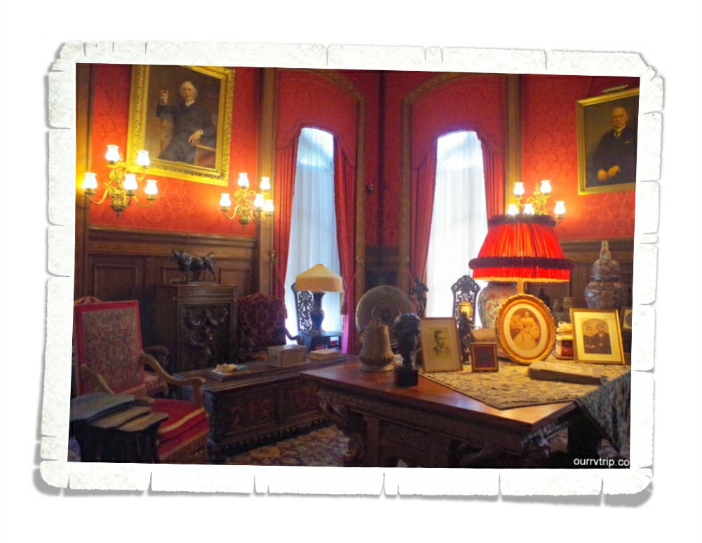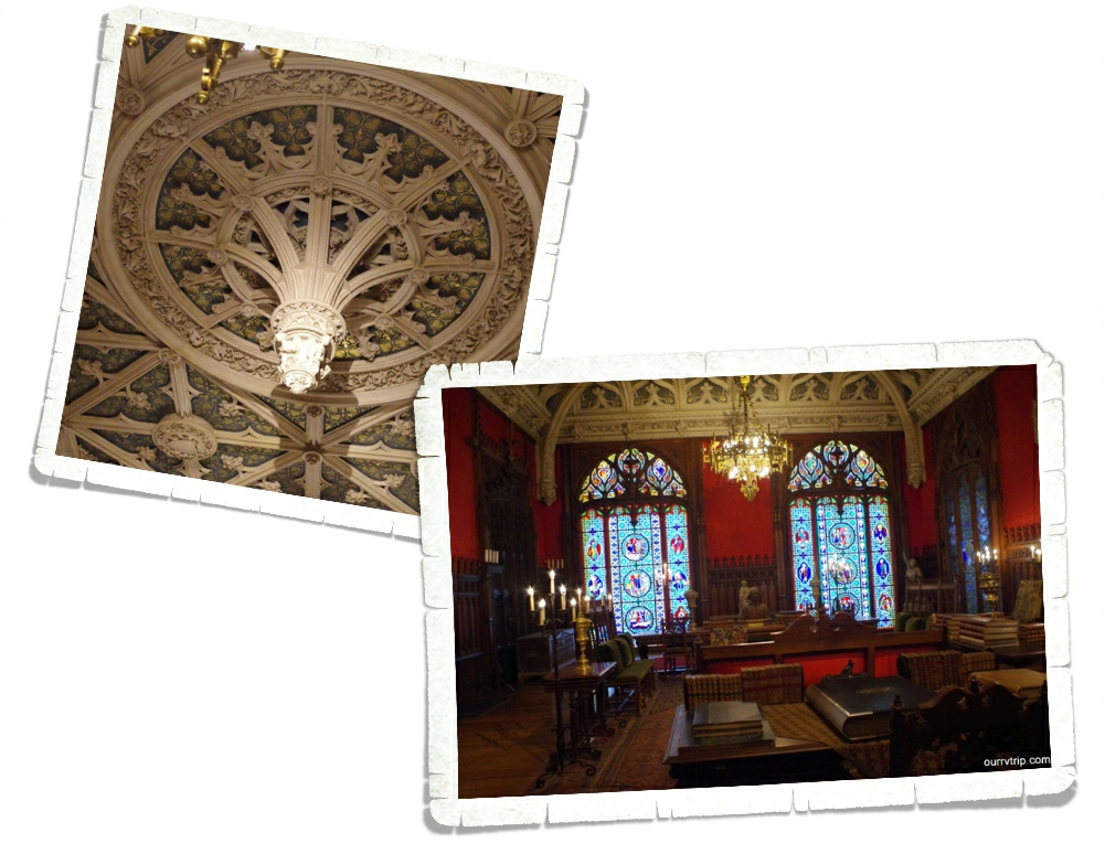 On one side of this massive banquet hall is a set of built in shelves with the organ loft up above. The organ actually works. In the basement, there’s a room that has the air pump for the organ. I love all of the built-in shelves! On the other side of the banquet hall is a wall of triple fireplaces. Because three is always better than one, right? This room was huge! The pictures can’t even begin to portray the true size of it. The ceiling in the banquet hall is seven stories high!