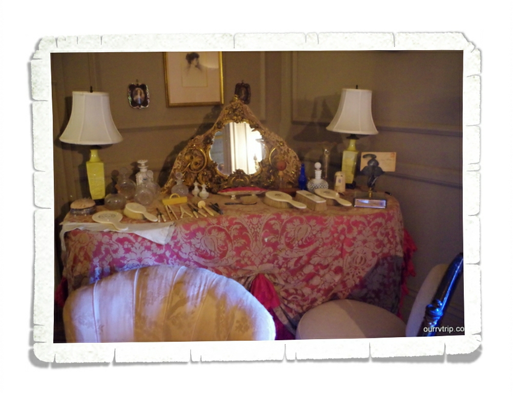 This is in one of the guest suites. I really enjoy the way they have the rooms set up. It’s like we’re getting to take a peak back in time. With the dress on the bed and the gloves draped over the footboard…it’s like catching a fleeting glimpse into their lives. There was also a vanity table all set up and waiting. This guest suite was just for single ladies. The single ladies and single gentlemen were kept in separate suits since it was inappropriate for them to sleep in the same area of the house.