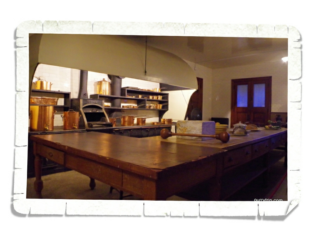 There would’ve been more than a dozen people in here working to prepare the meals for the Vanderbilt family and their guests. The copper pots hanging above the worktable are actually original. Check out the mortar and pestle! Huge! Nicholas and Alex agreed to stand next to it so you could really get an idea of the size of it.