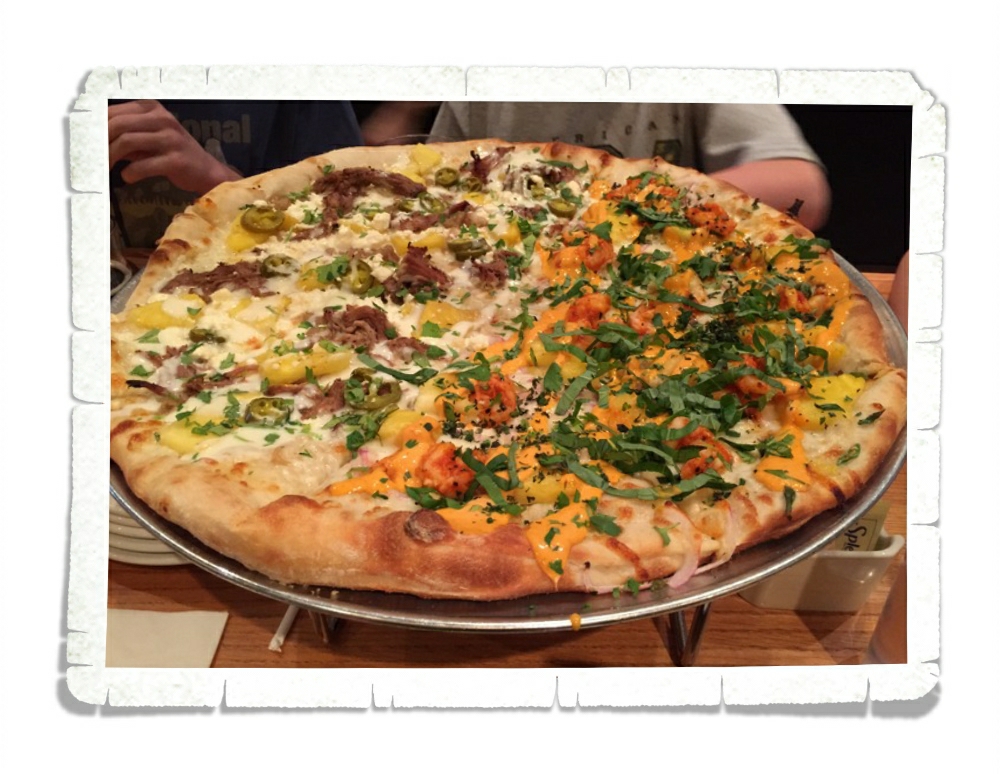 I got the pork pizza and it was not all too great, I think it would have been better with a red sauce and no feta, but that’s just me! We also got a half-n-half pizza with half Cuban pork and half sriracha shrimp pizza! Those aren’t flavors I’ve seen before!